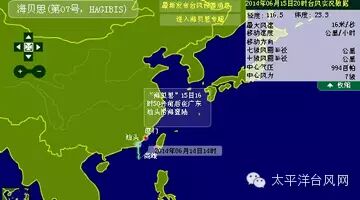 2014年第07号热带风暴海贝思(Hagibis)时间:6月15日13时,风速:23米/秒,移速:15公里/小时,东经:116.7°,北纬:22.7°,气压:988百帕,近中心最大风力:9级!