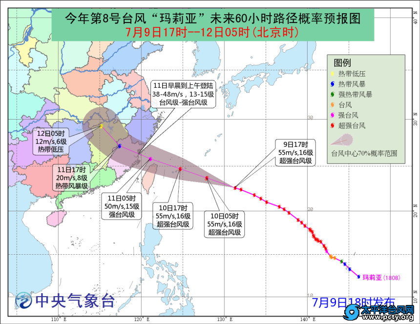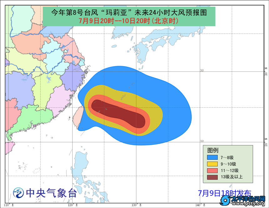 中央气象台9日18时发布台风橙色预警: 今年第8号台风“玛莉亚”(超强台风级)的中心今天(9日)下午17点钟位于台湾省宜兰县东偏南方约1000公里的西北太平洋洋面上,就是北纬22.6度,东经131.3度,中心附近最大风力有16级(55米/秒),中心最低气压为930百帕,七级风圈半径340-500公里,十级风圈半径120-180公里,十二级风圈半径70-90公里。 预计,“玛莉亚”将以每小时30公里左右的速度向西偏北方向移动,逐渐向台湾以东洋面靠近,将于10日夜间擦过或登陆台湾东北部,并于11日早晨到上午在福建晋江到浙江温州一带沿海再次登陆(台风级到强台风级,13-15级,38-48米/秒)。登陆后继续向西北方向移动,强度逐渐减弱。 大风预报:9日20时-10日20时,台湾以东和东海南部的风力将逐渐加大到7-10级,其中东海东南部和台湾东北洋面的部分海域风力可达11-12级,台风“玛莉亚”中心经过的附近洋面的风力有13-17级。